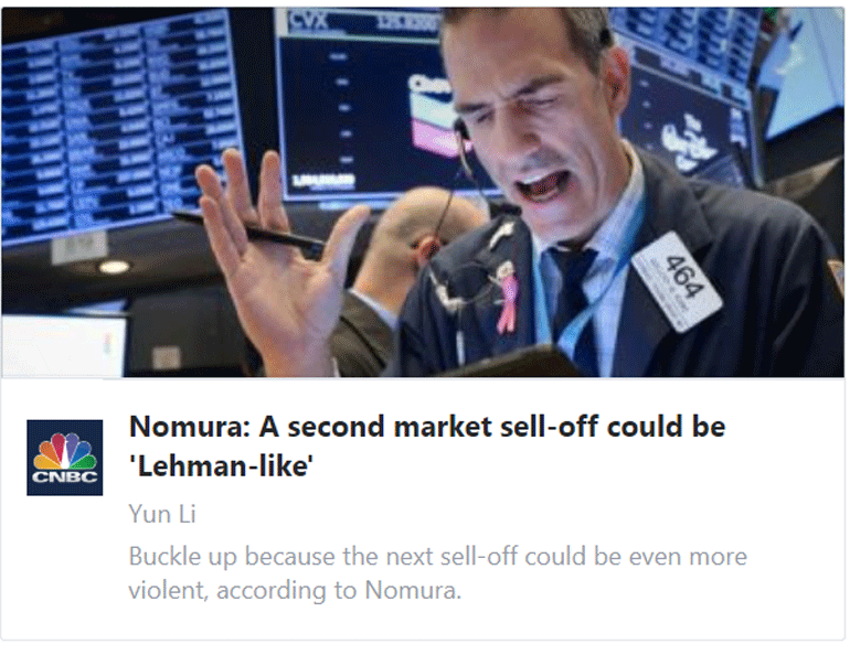 Στο κλίμα αυτό κινούνται και οι παρεμβάσεις – αναλύσεις του Bloomberg One Quant Sees Lehman Omens in Sell-Off That Many Have Dismissed, αλλά και του CNBC Nomura: A second market sell-off could be ‘Lehman-like’