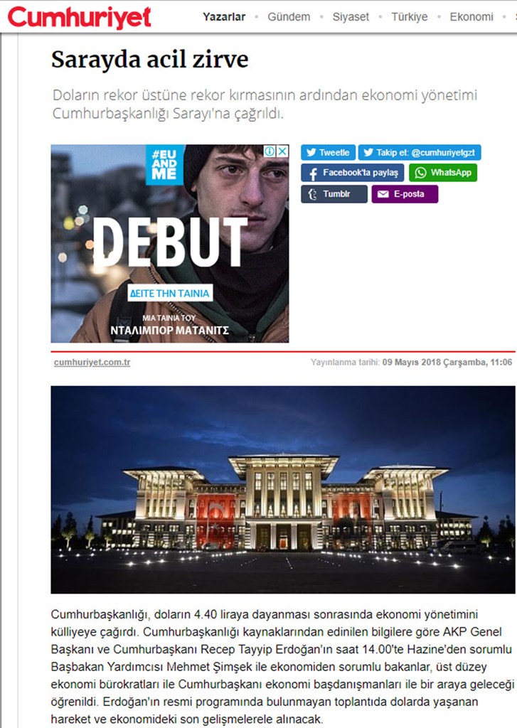 Έκτακτη σύσκεψη υπό τον πρόεδρο Ταγίπ Ερντογάν έχει προγραμματιστεί εντός της ημέρας και θα διεξαχθεί στο επονομαζόμενο «Saray», την προεδρική κατοικία στην Άγκυρα, με τη συμμετοχή όλου του οικονομικού επιτελείου της κυβέρνησης. Ο λόγος είναι απλός. Η ισοτιμία της τουρκικής λίρας με το δολάριο ξεπέρασε σήμερα το 4,40 και, παρά την παρέμβαση της κεντρικής τράπεζας της Τουρκίας, η πτωτική τάση δεν είναι δυνατόν να συγκρατηθεί.