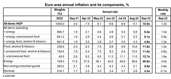 Σύμφωνα με τα στοιχεία της Eurostat, οι τιμές ενέργειας αυξήθηκαν 40,8% έναντι 38,6% τον Αύγουστο, ενώ των τροφίμων, του αλκοόλ και του καπνού 11,8% έναντι 10,6%.