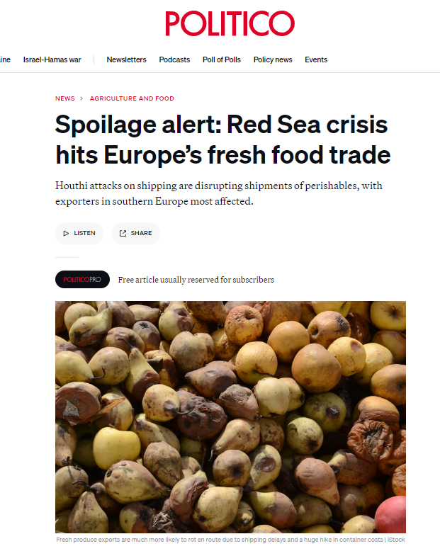Όπως επισημαίνει, οι ναυτιλιακές εταιρείες σταμάτησαν τις δραστηριότητές τους μέσω του στενού Bab el-Mandeb και εκ νέου δρομολογήθηκαν γύρω από το Ακρωτήριο της Καλής Ελπίδας, προσθέτοντας καθυστερήσεις έως και τριών εβδομάδων για τη μεταφορά από και προς την Ευρώπη. Εκτός από την πενταπλάσια αύξηση του κόστους των εμπορευματοκιβωτίων, αυτό σημαίνει ότι τα φρέσκα προϊόντα είναι πιο πιθανό να σαπίσουν στη διαδρομή.