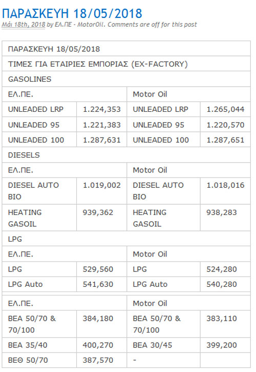 Στις 14/5/2018 η επίσημη μέση τιμή της Αμόλυβδης 95oct. στα 28 κράτη μέλη της Ε.Ε διαμορφώθηκε στο 1,437 και στην Ελλάδα στο 1,601 και στο Πετρέλαιο κίνησης Ε.Ε στο 1,333 και στην Ελλάδα στο 1,375.