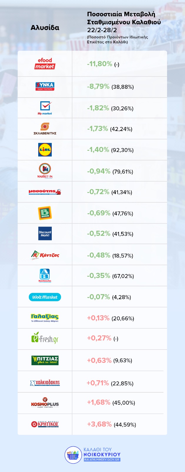 Αυτά αναφέρει ανακοίνωση του υπουργείου Ανάπτυξης και Επενδύσεων ενώ σημειώνεται ότι στο 91% των προϊόντων που περιλαμβάνονται στο «Kαλάθι του Nοικοκυριού», οι τιμές μειώνονται ή διατηρούνται σταθερές την 17η εβδομάδα εφαρμογής της πρωτοβουλίας της Κυβέρνησης (22/02/2023 -28/02/2023), με βάση τους νέους τιμοκαταλόγους που γνωστοποίησαν στο υπουργείο σήμερα, Τετάρτη 22 Φεβρουαρίου, οι αλυσίδες σούπερ μάρκετ.