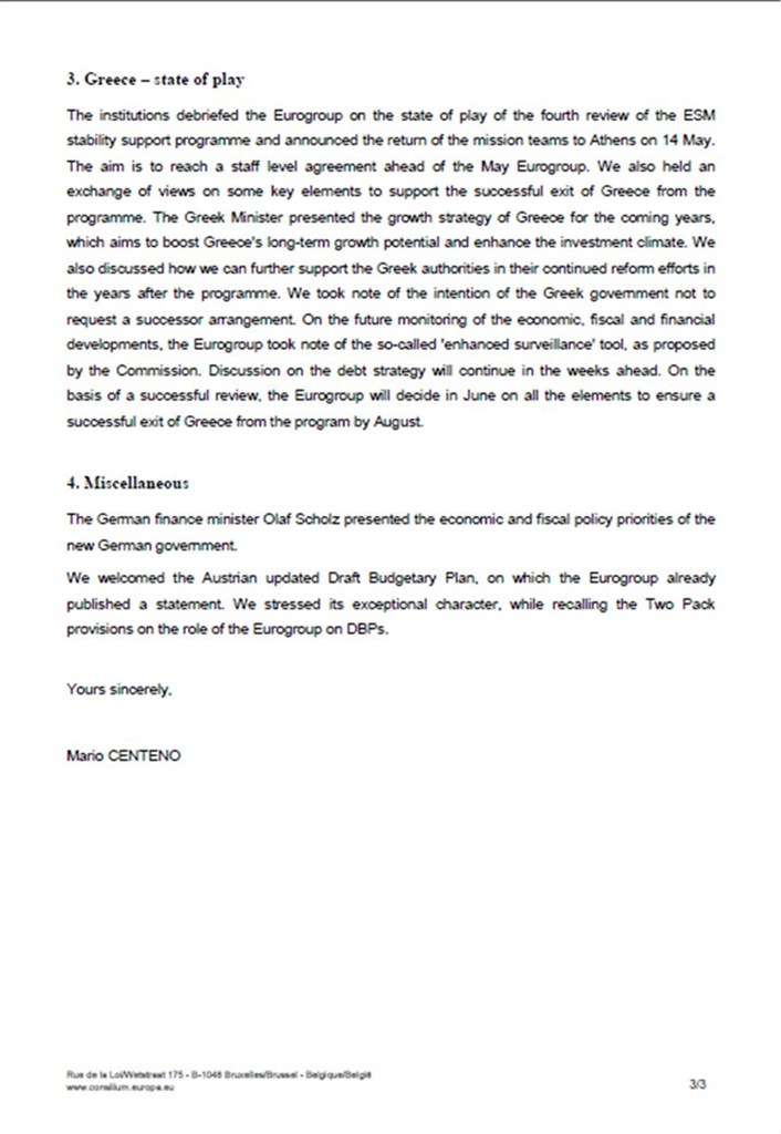 «Πραγματοποιήσαμε ανταλλαγή απόψεων σχετικά με ορισμένα βασικά στοιχεία για να υποστηρίξουμε την επιτυχή έξοδο της Ελλάδας από το πρόγραμμα. Ο Έλληνας Υπουργός παρουσίασε την αναπτυξιακή στρατηγική της Ελλάδας για τα επόμενα χρόνια, η οποία στοχεύει στην ενίσχυση την αναπτυξιακή δυναμική της Ελλάδας και στην ενίσχυση του επενδυτικού κλίματος» τονίζεται στην επιστολή.