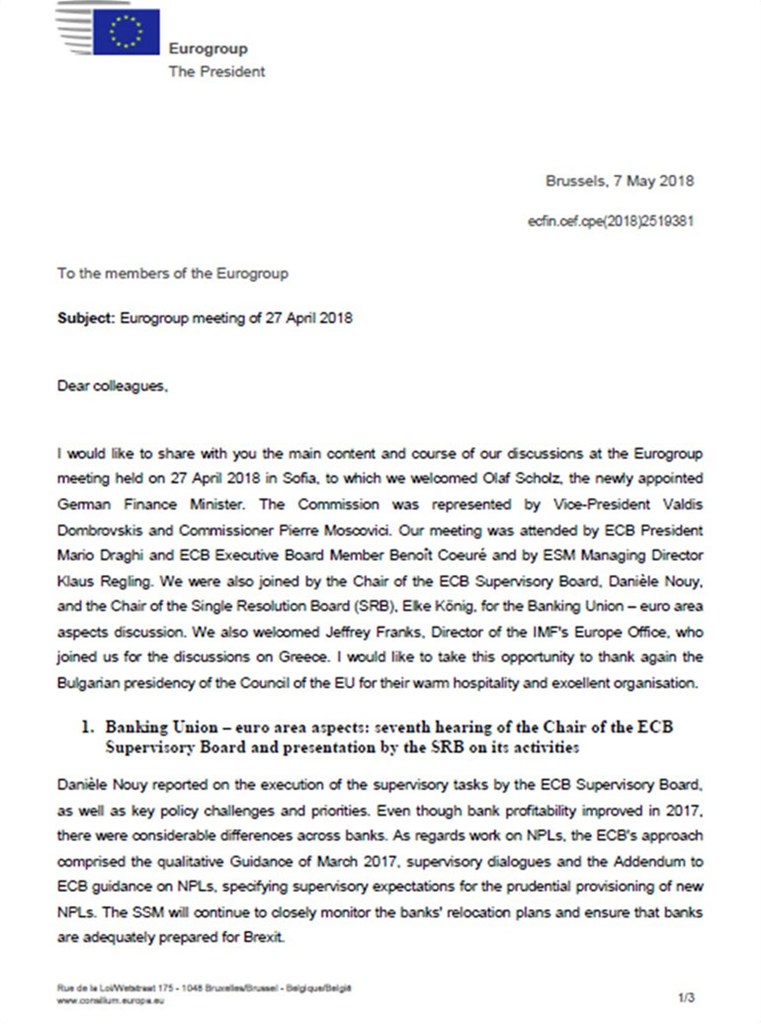 Ο επικεφαλής του Eurogroup στην επιστολή του για τη συνεδρίαση Σόφιας που πραγματοποιήθηκε τον Απρίλιο, επισημαίνει: «Το Eurogroup έλαβε υπόψη το λεγόμενο εργαλείο ”ενισχυμένης εποπτείας” όπως προτάθηκε από την Κομισιόν» («Τhe Eurogroup took note of the so-called ‘enhanced surveillance’ tool, as proposed by the Commission»).