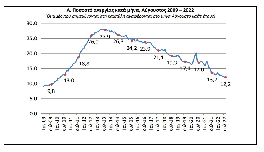 Σύμφωνα με την Ελληνική Στατιστική Αρχή (ΕΛΣΤΑΤ) το εποχικά διορθωμένο ποσοστό ανεργίας τον Αύγουστο του 2022 ανήλθε σε 12,2% έναντι του αναθεωρημένου προς τα κάτω 13,7% τον Αύγουστο του 2021 και του αναθεωρημένου προς τα κάτω 12,2% τον Ιούλιο του 2022.