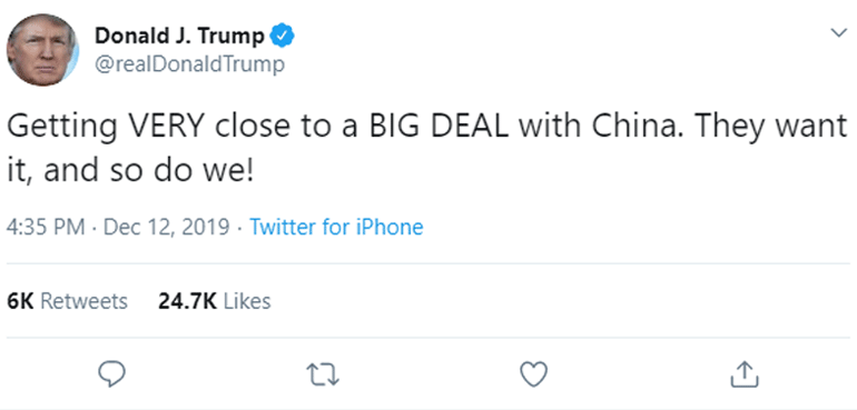 Το twitter του ένοικου του Λευκού Οίκου έρχεται λίγο πριν τη 15η Δεκεμβρίου, όταν και είναι να τεθούν σε ισχύ οι πρόσθετοι δασμοί στα κινεζικά αγαθά.