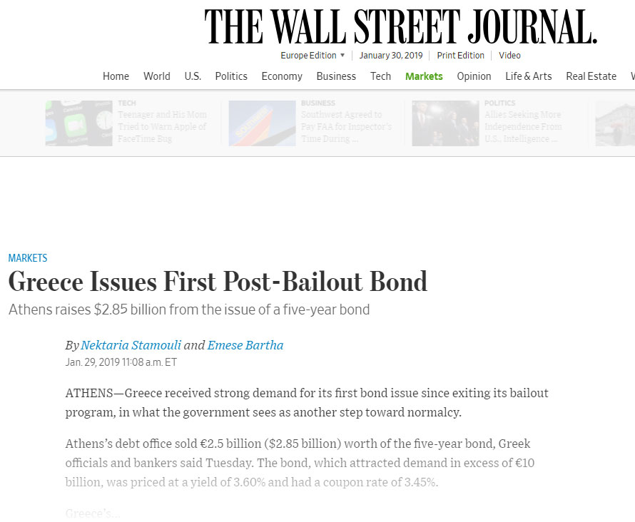 «Η Αθήνα στράφηκε στις αγορές δύο φορές από τον Ιούλιο του 2017, αλλά αναγκάστηκε να αλλάξει τα σχέδιά της για περισσότερες δοκιμαστικές εκδόσεις λόγω των αναταράξεων στην αγορά από την κρίση στην Ιταλία και την Τουρκία. Η χθεσινή έξοδος θεωρήθηκε ως ευκαιρία για επιστροφή, αν και η έκδοση 10ετούς ομολόγου θεωρείται ακόμη παρακινδυνευμένη. Η χθεσινή χρονική συγκυρία θεωρήθηκε ευνοϊκή επειδή το κόστος δανεισμού είχε υποχωρήσει με αφορμή την ψήφιση της Συμφωνίας των Πρεσπών από το Ελληνικό Κοινοβούλιο. Η συμφωνία αυτή δεν είναι καθόλου προσφιλής στην Ελλάδα και είναι πιθανό να αποτελέσει καθοριστικό παράγοντα για τις επόμενες εκλογές, που ενδεχομένως να διεξαχθούν μέχρι τον Μάιο. Το κυβερνών κόμμα του ΣΥΡΙΖΑ υπολείπεται στις δημοσκοπήσεις, εντούτοις κυβερνητικοί αξιωματούχοι ελπίζουν ότι θα ενισχύσουν τα ποσοστά τους όταν οι Έλληνες αρχίσουν να αντιλαμβάνονται ότι η οικονομία ανακάμπτει από τη μακρόχρονη κρίση. Η κυβέρνηση τώρα σχεδιάζει να εστιάσει τις προσπάθειές της εκ νέου στην οικονομία και η χθεσινή επιτυχής έκδοση που πραγματοποιήθηκε χωρίς το προστατευτικό δίχτυ του προγράμματος διάσωσης στοχεύει να αποδείξει ότι η χώρα βρίσκεται και πάλι στο επίκεντρο των επενδυτών. Η ελληνική οικονομία επέστρεψε στην ανάπτυξη, αλλά παραμένει η πιο αδύναμη οικονομικά χώρα στην Ευρωζώνη» καταλήγει στο δημοσίευμά της η «WSJ».