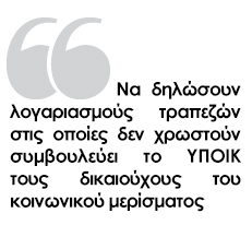 Να ανοίξουν λογαριασμό σε άλλη τράπεζα ή να δηλώσουν κάποιον άλλον συμβουλεύει το Yπουργείο Οικονομικών τις οικογένειες που θα κάνουν αίτηση για το κοινωνικό μέρισμα αλλά έχουν ανεξόφλητα χρέη από κάρτες και δάνεια.