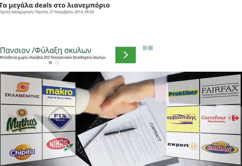 Στα μεγάλα deals των τελευταίων μηνών συγκαταλέγονται αυτό της καναδικής Fairfax που εξαγόρασε 14 καταστήματα της Praktiker Hellas, της μεγαλύτερης εταιρείας του γερμανικού ομίλου στο εξωτερικό, με το τίμημα να ξεπερνάει τα 20 εκατ. ευρώ. Η Praktiker Hellas κάνει κάθε χρόνο τζίρο 195 εκατ. ευρώ και διαθέτει 14 καταστήματα σε όλη την Ελλάδα, στα οποία απασχολούνται 1.100 άτομα.
