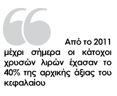 Σήμερα ο ίδιος αριθμός λιρών αξίζει μόλις 16,6 εκατ. ευρώ λόγω της βουτιάς της τιμής του χρυσού και της απόκλισης που υπάρχει μεταξύ της τιμής πώλησης και αγοράς. Δηλαδή, από το 2011 μέχρι σήμερα οι κάτοχοι λιρών έχασαν το 40% της αρχικής άξιας του κεφαλαίου και η συνολική ζημία ανέρχεται σε 11 εκατ. ευρώ.