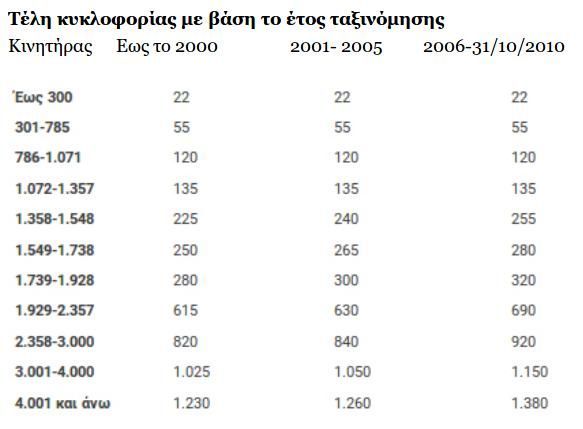 Από 22- 1.260 ευρώ για οχήματα που κυκλοφόρησαν από 2001 έως 2005.