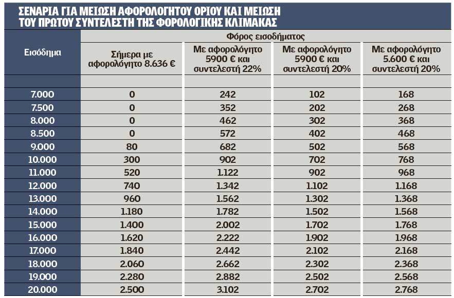 Με μείωση του συντελεστή στο 20%, οι επιβαρύνσεις περιορίζονται. Για παράδειγμα αν το αφορολόγητο προσγειωθεί στις 5.900 ευρώ από 8.636 ευρώ που είναι σήμερα ένας μισθωτός χωρίς παιδιά με αποδοχές 500 ευρώ τον μήνα, ενώ μέχρι τώρα είναι αφορολόγητος, θα κληθεί να πληρώσει φόρο 242 ευρώ, με βάση την ισχύουσα κλίμακα και πρώτο συντελεστή 22%. Αν ο συντελεστής μειωθεί στο 20% τότε ο φόρος που θα προκύψει περιορίζεται στα 103 ευρώ.