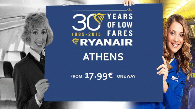 Για να γιορτάσουμε την ανακοίνωση του καλοκαιρινού προγράμματος για το 2016, απελευθερώνουμε ναύλους προς κράτηση από 17.99 €, στα δρομολόγια από Αθήνα προς Θεσσαλονίκη, Ρόδο και Χανιά, διαθέσιμοι προς κράτηση μέχρι τα μεσάνυχτα της Τετάρτης, 16 Σεπτεμβρίου, για ταξίδια που θα πραγματοποιηθούν τον Οκτώβριο και τον Νοέμβριο. Καθώς οι συγκεκριμένοι χαμηλοί ναύλοι θα εξαντληθούν σύντομα, οι πελάτες μας θα πρέπει να συνδεθούν στην ιστοσελίδα www.ryanair.com ώστε να μην χάσουν την ευκαιρία».