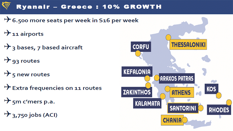 Η Ryanair ανακοίνωσε στις 14 Σεπτεμβρίου 2015 σε κεντρικό ξενοδοχείο της Αθήνας το καλοκαιρινό πρόγραμμα πτήσεων από το αεροδρόμιο «Ελευθέριος Βενιζέλος» για το 2016, με ένα νέο καθημερινό δρομολόγιο προς το Βερολίνο, περισσότερες πτήσεις προς Ρόδο και Σαντορίνη και 13 δρομολόγια σε σύνολο, συντελώντας στην μεταφορά 2.4 εκατομμυρίων επιβατών και στην στήριξη 1.800 παράπλευρων θέσεων εργασίας στο αεροδρόμιο της Αθήνας.