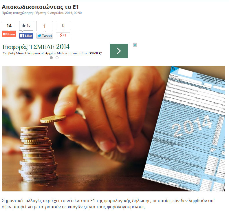 Αναφορικά με τους επιτηδευματίες, πριν αυτοί συμπληρώσουν το Ε1 θα πρέπει να επιλέξουν και να συμπληρώσουν το Ε3 ή το Ε2, εάν εισπράττουν ενοίκια. Στο μενού επιλογής της δήλωσης εμφανίζεται και το επίδομα τέκνων για τους φορολογουμένους που το έλαβαν από τον ΟΓΑ το 2014 με βάση το έντυπο Α21. Μετά τη συμπλήρωση και υποβολή του Ε1, οι φορολογούμενοι αυτοί θα πρέπει να υποβάλουν τη σχετική αίτηση για να λάβουν το επίδομα και το 2015.