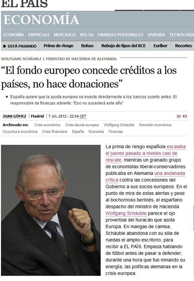 Οι δηλώσεις αυτές προκάλεσαν αναστάτωση στην Ισπανία, τη στιγμή που η χώρα βρίσκεται στην διαδικασία οριστικοποίησης των όρων του δανεισμού της από τους ευρωπαίους εταίρους της για την ανακεφαλαιοποίηση του τραπεζικού της τομέα, που αντιμετωπίζει τεράστιες δυσκολίες.