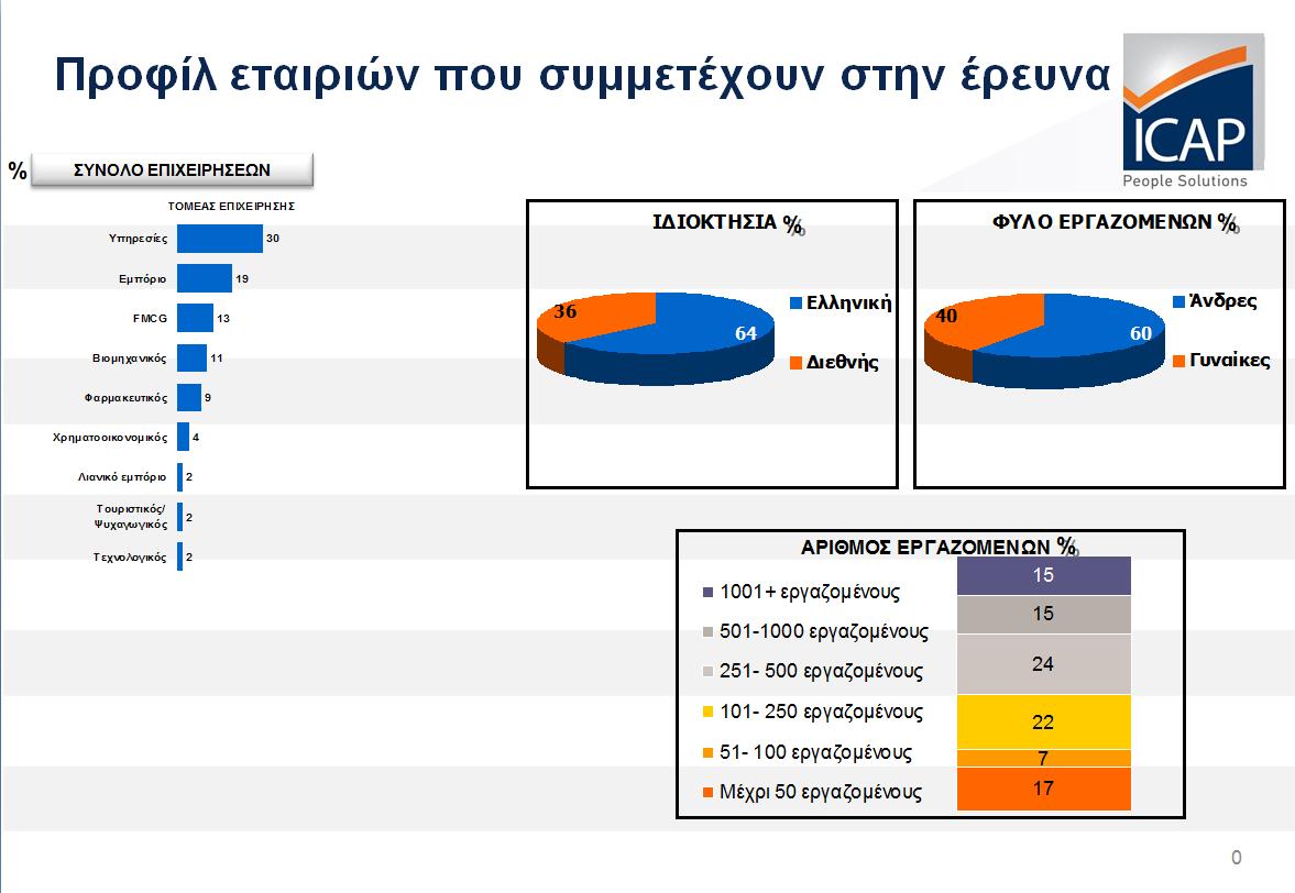 Οι επιχειρήσεις που έλαβαν μέρος και απάντησαν στην έρευνα αυτή ήταν σε ποσοστό 64% ελληνικές, 53% είχαν τζίρο πάνω από 100 εκατ. ευρώ, 54% είχαν πάνω από 200 εργαζόμενους, 30% δραστηριοποιούνται στον τομέα των υπηρεσιών και 19% σε αυτόν του εμπορίου.