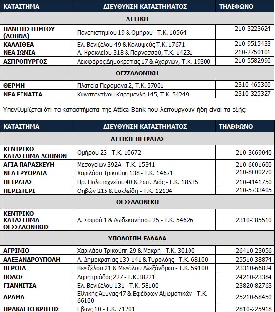 Για την καλύτερη εξυπηρέτηση των πελατών της η Attica Bank από την Παρασκευή 10 Ιουλίου 2015, θέτει στη διάθεσή τους 6 επιπλέον καταστήματα: