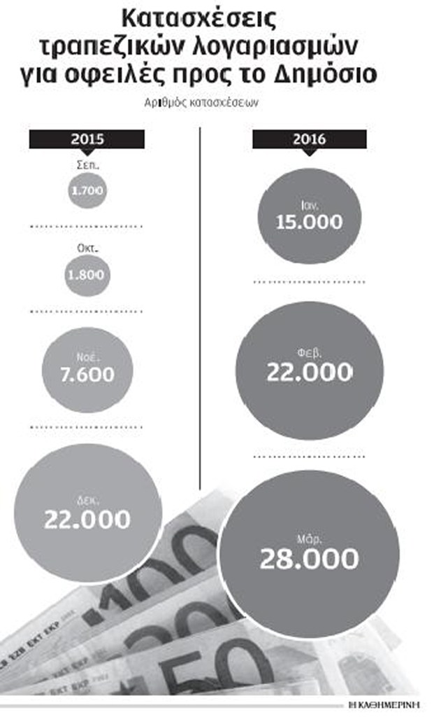 Με καταιγιστικό ρυθμό πολλαπλασιάζονται τους τελευταίους μήνες τα κατασχετήρια τραπεζικών λογαριασμών για οφειλές προς το Δημόσιο, που κατά μέσο όρο ανέρχονται σε 10.000 την ημέρα.