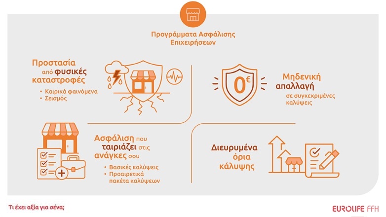 Η Eurolife FFH αναγνωρίζοντας την ανάγκη των σύγχρονων επιχειρήσεων για ουσιαστική υποστήριξη προσφέρει, εκτός από την ασφάλιση περιουσίας, ένα ολοκληρωμένο ασφαλιστικό πλαίσιο, και συγκεκριμένα: