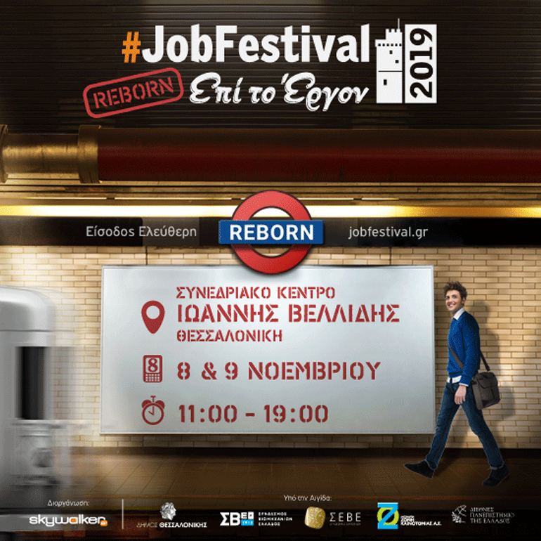 Συνεχίζοντας την επιτυχημένη πορεία του, το Thessaloniki #JobFestival 2019 Reborn του Skywalker.gr δημιουργεί το κατάλληλο περιβάλλον ώστε οι επισκέπτες να πραγματοποιήσουν με επιτυχία το ξεκίνημά τους στην αναζήτηση εργασίας ή το επόμενο βήμα στην καριέρα τους.