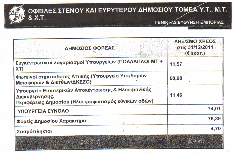 Υπέρογκες οφειλές ύψους 155 εκατομμύριων ευρώ έχει ο στενός αλλά και ευρύτερος Δημόσιος Τομέας απέναντι στη ΔΕΗ, όπως προκύπτει από τον ετήσιο έλεγχο του 2011 ο οποίος ολοκληρώθηκε και δημοσιεύθηκε το Φεβρουάριο του 2012.