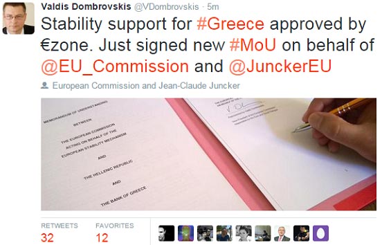Το νέο, τριετές δάνειο προς την Ελλάδα, συνολικού ύψους 86 δισ. ευρώ, ενέκρινε και επισήμως η Κομισιόν. «Η χρηματοπιστωτική στήριξη της Ελλάδας μόλις εγκρίθηκε από την Ευρωζώνη» ανέφερε σε μήνυμά του στα μέσα κοινωνικής δικτύωσης, ο αντιπρόεδρος της Κομισιόν, Βάλντις Ντομπρόβσκις.