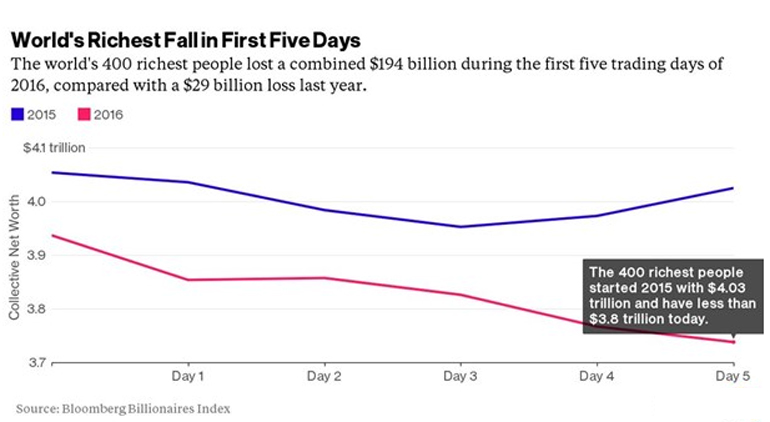Kάτι παραπάνω από 194 δισεκατομμύρια δολάρια έχασαν οι 400 πιο πλούσιοι επιχειρηματίες και επενδυτές στον κόσμο την πρώτη εβδομάδα του 2016.