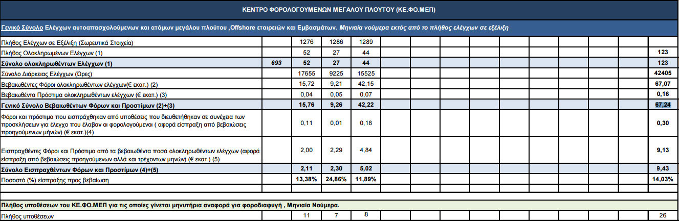 Παράλληλα, ο έλεγχος που διενεργεί το κέντρο φορολογουμένων μεγάλου πλούτου φαίνεται ότι αποδίδει καρπούς, σύμφωνα με τα στοιχεία της Γενικής Γραμματείας Δημοσίων Εσόδων.