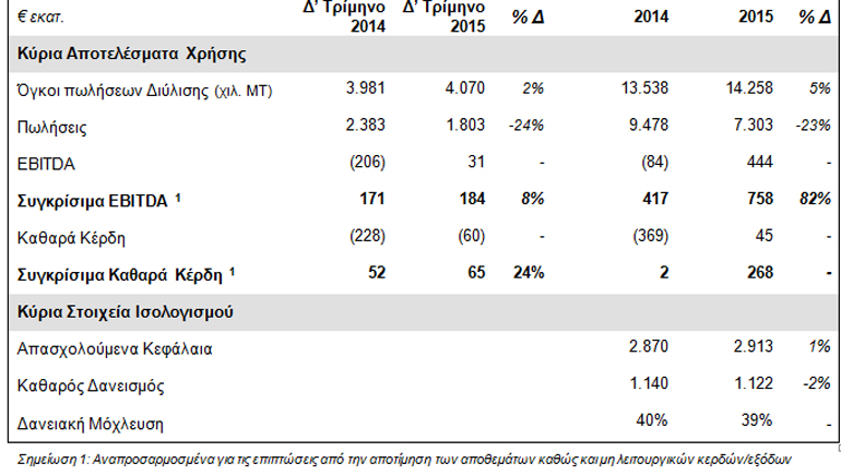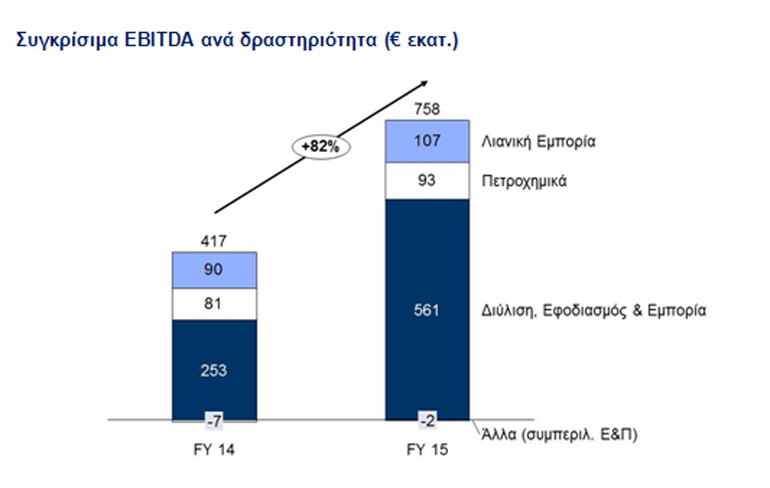 Τα Συγκρίσιμα Κέρδη EBITDA στο Δ’ Τρίμ. 2015 ανήλθαν στα €184 εκατ., λόγω υψηλών επιδόσεων των διυλιστηρίων του Ομίλου, αριστοποίησης του εφοδιασμού και περιθωρίων διύλισης. Τα διυλιστήρια σημείωσαν αύξηση παραγωγής, οδηγώντας σε ενίσχυση των εξαγωγών στα 2,15 εκατ. τόνους, αντιπροσωπεύοντας το 53% των συνολικών πωλήσεων. Σημαντική βελτίωση κερδοφορίας σημείωσε και ο κλάδος Εμπορίας, τόσο στην Ελλάδα όσο και στο εξωτερικό.
