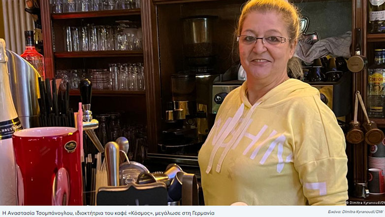Τελευταία στάση, ένα ακόμη στέκι Ελλήνων της Γερμανίας και όχι μόνο. Το καφέ-μπαρ «Κόσμος» παίζει στο φόντο αδιάλειπτα ελληνικές ειδήσεις, όμως η ιδιοκτήτριά του, Αναστασία Τσομπάνογλου, με καταγωγή από την Κοζάνη και μεγαλωμένη στη Γερμανία δεν χάνει κυριολεκτικά ούτε μια είδηση από τα γερμανικά μέσα. «Οφείλουμε να ενημερωνόμαστε κάθε μέρα για ό,τι συμβαίνει στη Γερμανία γιατί μας επηρεάζει άμεσα και βέβαια παρακολουθούμε από μακριά τις πολιτικές εξελίξεις στην Ελλάδα» μας λέει. Οι συζητήσεις των θαμώνων περιστρέφονται γύρω από την πολιτική και την καθημερινότητα στις δύο χώρες. Και η ίδια θεωρεί ότι η Γερμανία έχει αλλάξει μέσα στις δεκαετίες, με τα πράγματα να έχουν γίνει πιο «στενά» για τους μισθωτούς και τους ελεύθερους επαγγελματίες. Ειδικά τα τελευταία χρόνια εξαιτίας της πανδημίας και του πολέμου στην Ουκρανία.
