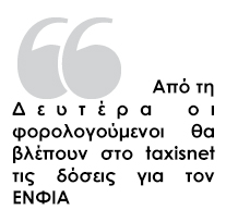 2. Από Δευτέρα 22/9 και σταδιακά (εντός τριών ημερών) οι φορολογούμενοι, για τους οποίους θα γίνει νέα εκκαθάριση του φόρου, θα μπορούν να εκτυπώνουν τα νέα εκκαθαριστικά του ΕΝΦΙΑ. Εναλλακτικά στην περίπτωση που κάποιος φορολογούμενος δεν είναι πιστοποιημένος χρήστης του Taxisnet, θα μπορεί να ενημερώνεται για την οφειλή του (ταυτότητα οφειλής) από το τμήμα Εσόδων οποιασδήποτε Δ.Ο.Υ.