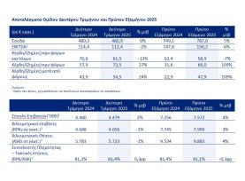 Ο ενοποιημένος κύκλος εργασιών το Α’ Εξάμηνο ανήλθε σε €787,0 εκατ., καταγράφοντας αύξηση 5%. Το EBITDA αυξήθηκε κατά 6%, φτάνοντας τα €156,2 εκατ. Τα Κέρδη προ φόρων διαμορφώθηκαν σε €66,0 εκατ., έναντι €31,6 εκατ. το Α’ εξάμηνο του 2024, ενώ τα Κέρδη μετά από φόρους διαμορφώθηκαν σε €47,9 εκατ., από €22,9 εκατ. την αντίστοιχη περίοδο του 2024.
