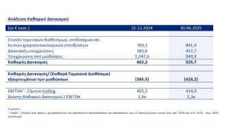 Τα ταμειακά αποθέματα και τα άμεσα ρευστοποιήσιμα χρηματοοικονομικά στοιχεία αυξήθηκαν σε €841,9 εκατ. στις 30.06.2025 από €769,1 εκατ. στις 31.12.2024, πάρα την καταβολή μερίσματος ύψους €72,1 εκατ. στους μέτοχους στις 26.05.2025. Σημειώνεται ότι στα ταμειακά αποθέματα δεν συμπεριλαμβάνεται το επιπλέον ταμειακό απόθεμα που προέκυψε από την έκδοση του νέου ομολογιακού δανείου στις αρχές Ιουλίου του 2025.