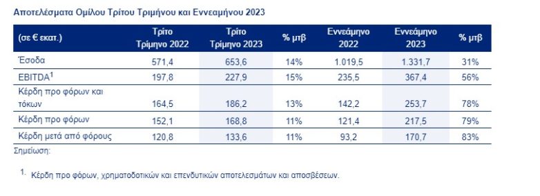 Στο τρίτο τρίμηνο του 2023, συγκριτικά με το αντίστοιχο τρίμηνο του 2022 το οποίο μέχρι σήμερα ήταν το ιστορικά υψηλότερο σε επίπεδο κύκλου εργασιών και κερδοφορίας, ο Ενοποιημένος Κύκλος Εργασιών σημείωσε 14% αύξηση φτάνοντας τα €653,6 εκατ. Τα Κέρδη προ φόρων διαμορφώθηκαν σε €168,8 εκατ. και τα Κέρδη μετά από φόρους σε €133,6 εκατ. από Κέρδη μετά από φόρους €120,8 εκατ. το τρίτο τρίμηνο του 2022, καταγράφοντας νέο ιστορικό υψηλό.
