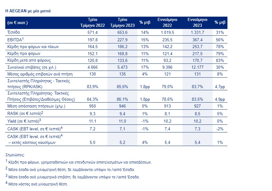 H AEGEAN ανακοίνωσε, αργά το απόγευμα, τα βασικά οικονομικά και οργανικά αποτελέσματα για το εννεάμηνο και το γ΄ τρίμηνο του 2023.