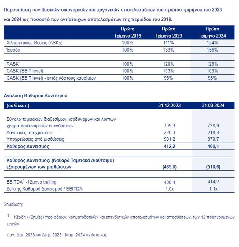 Ο Όμιλος συνεχίζει απρόσκοπτα το επενδυτικό του πλάνο στο νέο στόλο έχοντας παραλάβει 7 νέα αεροσκάφη σε σχέση με το Μάρτιο του 2023 ενώ έχει προβεί και σε επέκταση λειτουργικών μισθώσεων φθάνοντας συνολικά τα 79 αεροσκάφη, με αποτέλεσμα το κονδύλι των αποσβέσεων να έχει αυξηθεί κατά 19% σε σχέση με την αντίστοιχη περίοδο του 2023.