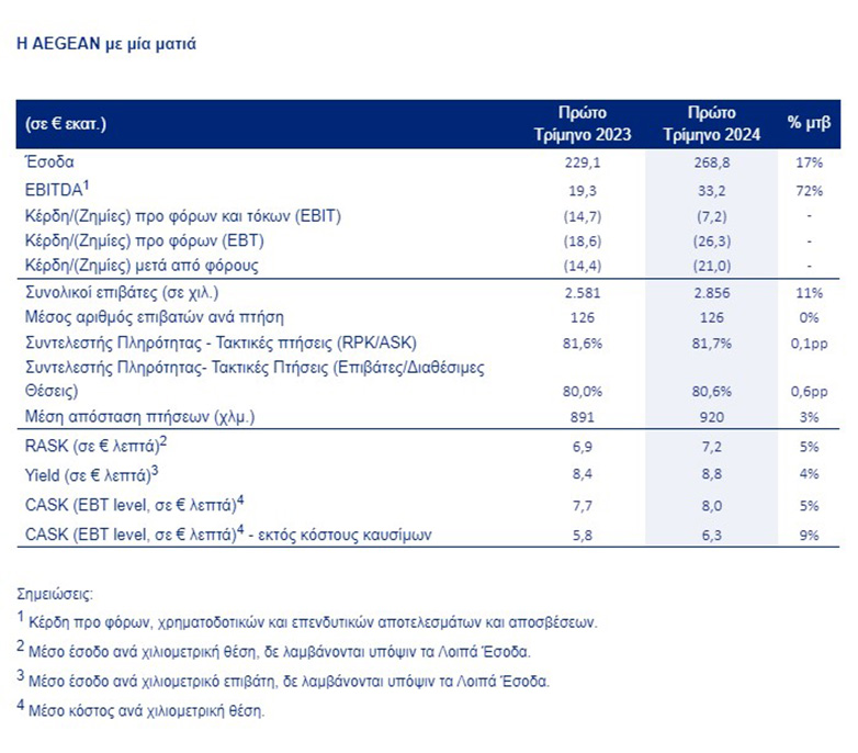 Η AEGEAN παρέμεινε σταθερή στη στρατηγική ανάπτυξης και σε συνδυασμό με την ορθολογική διαχείριση του κόστους της, πέτυχε αύξηση των κερδών ΕΒΙΤDA, ήτοι κέρδη €33,2 εκατ. από κέρδη €19,3 εκατ. την αντίστοιχη περίοδο του 2023, αλλά και βελτίωσε τα λειτουργικά της αποτελέσματα (EBIT) με μικρότερες ζημίες €7,2 εκατ. έναντι €14,7 εκατ. το 2023.
