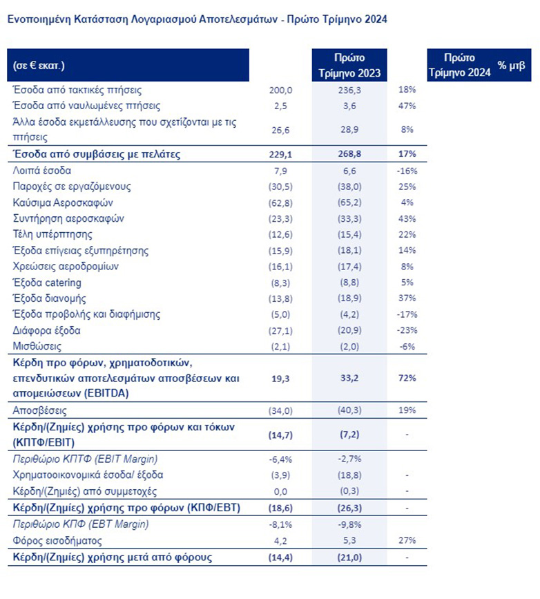 Παρά τη βελτίωση της λειτουργικής κερδοφορίας οι ζημίες μετά από φόρους διαμορφώθηκαν σε €21,0 εκατ. από ζημίες €14,4 εκατ. το πρώτο τρίμηνο του 2023, λόγω της αρνητικής μεταβολής στην ισοτιμία του δολαρίου από την αρχή του έτους που επηρεάζει την αποτίμηση των μελλοντικών ροών των μισθώσεων αεροσκαφών.