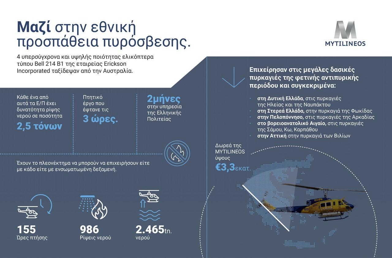 Ο Επιτελάρχης του Π.Σ. Αντιστράτηγος Αλέξιος Ράπανος δήλωσε: «Εκ μέρους του Αρχηγού του Πυροσβεστικού Σώματος, από τη θέση του Επιτελάρχη, εκφράζω την ευγνωμοσύνη μας στην εταιρεία MYTILINEOS για τη δωρεάν παραχώρηση των τεσσάρων ελικοπτέρων, που ήρθαν να ενισχύσουν τις προσπάθειές μας στην αντιμετώπιση των δασικών πυρκαγιών. Νιώθω επίσης την ανάγκη να ευχαριστήσω τους πιλότους των ελικοπτέρων που επιχείρησαν μαζί μας σε πολύ δύσκολες συνθήκες παρέχοντας τα μέγιστα. Η προσφορά σας, ιδιαίτερα σε κρίσιμες περιόδους, αποτελεί έμπρακτη απόδειξη αρωγής και ευαισθησίας τόσο στην πολιτεία όσο και στις ανάγκες των συνανθρώπων μας.»