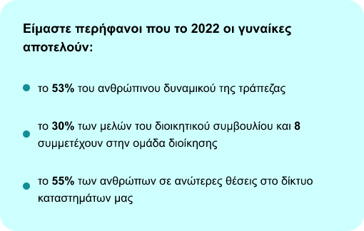 Σε μια εποχή που η γυναικεία εργασία παρέμενε εξαιρετικά περιορισμένη, η Εθνική μας Τράπεζα έκανε την ισότητα των φύλων δέσμευσή της. Από το 1911 μέχρι σήμερα, έχοντας πραγματοποιήσει ουσιαστικά βήματα για την ισότητα των φύλων, καταφέραμε να είμαστε η πρώτη ελληνική τράπεζα που συμμετέχει για 5η συνεχόμενη χρονιά στο δείκτη ισότητας των φύλων του Bloomberg.