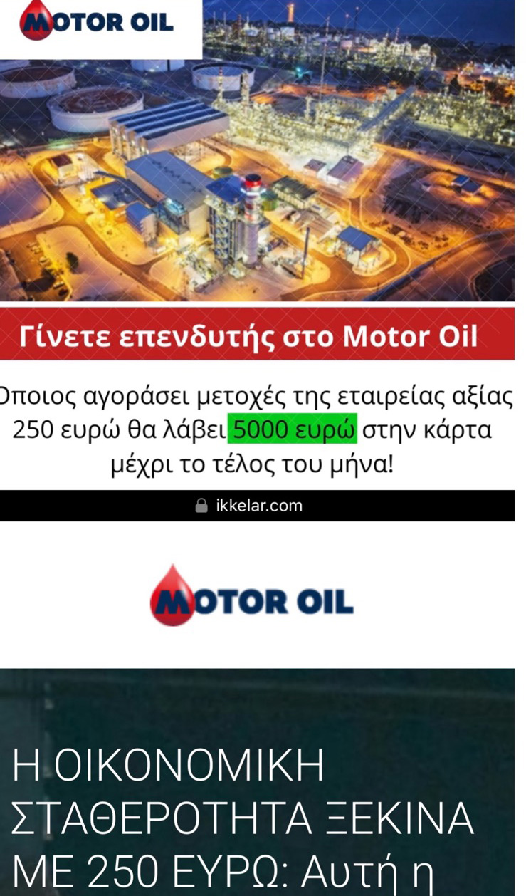 Μια επενδυτική απάτη «παραφυλάει» αυτές τις μέρες στο διαδίκτυο και συγκεκριμένα στα κοινωνικά δίκτυα, όπως το Facebook. Συγκεκριμένα, σύμφωνα με καταγγελία αναγνώστη της «Ζούγκλας», στα social media κυκλοφορεί μια διαφήμιση που καλεί τους χρήστες να επενδύσουν σε μετοχή, αξίας 250 ευρώ, της εταιρείας Motor Oil ώστε να κερδίσουν 5.000 ευρώ μέχρι το τέλος του μήνα.