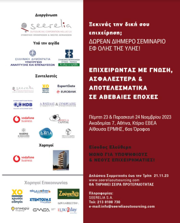 Η εταιρεία Συρέλια Σύμβουλοι Επιχ/σεων (Ελλάς) Α.Ε./Seerelia Outsourcing Corp. (Hellas) S.A., υπό την αιγίδα του υπουργείου ανάπτυξης και επενδύσεων (ΥΠΑΝ), του συνδέσμου βιομηχανιών Αττικής & Πειραιά (ΣΒΑΠ), την ευγενική χορηγία της VODAFONE Α.Ε. & της ΕΛΛΗΝΙΚΗΣ ΚΑΤΑΣΚΕΥΑΣΤΙΚΗΣ Ι.Κ.Ε. και σε συνεργασία με φορείς οι οποίοι συνδέονται άρρηκτα & δημιουργικά με την επιχειρηματικότητα, (π.χ. νομική & λογιστική εταιρεία, τραπεζικοί οργανισμοί, εταιρεία μάρκετινγκ κ.λ.π.) οι οποίοι ανταποκρίθηκαν στην πρόσκληση του Ιωάννη Τεάζη, διευθύνοντα συμβούλου της Συρέλια Σύμβουλοι Επιχ/σεων (Ελλάς) Α.Ε., να συμμετάσχουν σε μία δράση εταιρικής κοινωνικής ευθύνης, με περιεχόμενο, σκοπιμότητα και κοινωνική διάσταση, υλοποιεί στο ΕΒΕΑ την 23η & 24η του Νοέμβρη, ΔΩΡΕΑΝ ΔΙΗΜΕΡΟ σεμινάριο, «εφ’όλης της ύλης», το οποίο απευθύνεται σε υποψήφιους επιχειρηματίες.