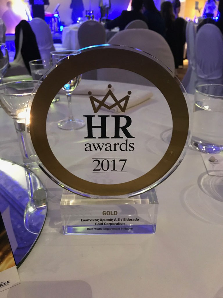 Σε μια λαμπρή εκδήλωση που έλαβε χώρα στην Αθήνα την 1η Νοεμβρίου 2017, και σε συνέχεια μιας σειράς διακρίσεων που προηγήθηκαν τα προηγούμενα έτη ως επιβράβευση της πολιτικής και των πρακτικών της Ελληνικός Χρυσός στον τομέα του ανθρώπινου δυναμικού, η ηγετική ομάδα του τμήματος Ανθρώπινου Δυναμικού της εταιρείας από κοινού με τους συνεργάτες που συνέβαλαν στην πράξη στην μέγιστη και βέλτιστη αποτελεσματικότητα αυτής της φιλοσοφίας, παρέλαβαν το «Gold» βραβείο των HR Awards 2017, παρουσιάζοντας το όραμα αλλά και τους στόχους της επόμενης μέρας ως προς την ουσιαστική κοινωνική συνεισφορά στην Χαλκιδική και κατ’ επέκταση σε περιφερειακό και εθνικό επίπεδο, αλλά και την έμπρακτη στήριξη στην νεανική απασχόληση και την σχέση με τους νέους ανθρώπους.
