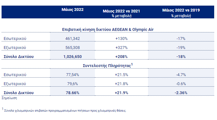 Σημαντική ανάκαμψη στην επιβατική κίνηση κατέγραψε η AEGEAN τον Μάιο του τρέχοντος έτους, μεταφέροντας περισσότερους από 1 εκατ. επιβάτες μόλις κατά την έναρξη της νέας καλοκαιρινής περιόδου. Ειδικότερα, η AEGEAN μετέφερε περισσότερους από 565 χιλ. επιβάτες στο δίκτυο εξωτερικού και περίπου 461 χιλ. επιβάτες στο δίκτυο εσωτερικού έχοντας επαναφέρει το 85% των συχνοτήτων της σε σχέση με το 2019. Χαρακτηριστικό των παραπάνω επιδόσεων είναι ότι η εταιρεία μετέφερε σε ένα μήνα σχεδόν όσους επιβάτες είχε μεταφέρει αθροιστικά κατά το 1ο τρίμηνο του έτους. Ο συντελεστής πληρότητας τον Μάϊο έφτασε σε σχεδόν 79%, με μέσο όρο επιβατών 122 επιβάτες ανά πτήση, φτάνοντας μάλιστα τα προ-πανδημίας επίπεδα κατά την τελευταία εβδομάδα του Μαΐου.