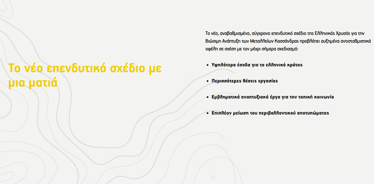 Η επενδυτική συμφωνία προβλέπει συγκεκριμένα την έναρξη παραγωγής στο μεταλλείο των Σκουριών, την αύξηση της παραγωγής στην Ολυμπιάδα κατά περισσότερο από 50% και την αναβάθμιση του λιμανιού του Στρατωνίου. Και όλα αυτά, με συνεχείς καταμετρήσεις και αξιολογήσεις του περιβαλλοντικού αποτυπώματος των εργασιών και την απόλυτη και κατοχυρωμένη δέσμευση ότι το τοπικό οικοσύστημαθα αποκατασταθεί πλήρως μετά το πέρας των εργασιών.