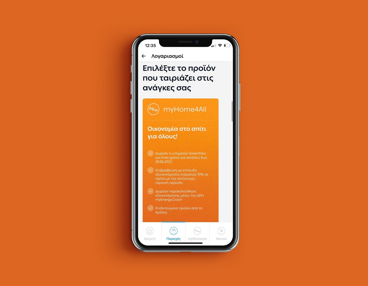 Για παράδειγμα, στο myΔΕΗ μπορεί να ενεργοποιηθεί ηλεκτρονικά το ΔΕΗ myHome 4All, το νέο οικιακό κυμαινόμενο πρόγραμμα της ΔΕΗ, που περιέχει δωρεάν την υπηρεσία GreenPass δίνοντας την δυνατότητα σε νέους και υφιστάμενους πελάτες να μειώσουν το ενεργειακό τους αποτύπωμα, ενώ τους ανταμείβει όταν εξοικονομούν ενέργεια.