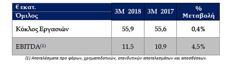 Τα ενοποιημένα κέρδη προ τόκων, φόρων και αποσβέσεων (EBITDA) από συνεχιζόμενες δραστηριότητες εξακολουθούν να καταγράφουν βελτίωση και διαμορφώθηκαν στα € 11,5 εκ. παρουσιάζοντας αύξηση 4,5%.
