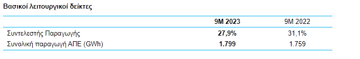 Σε επίπεδο Εννεαμήνου, η ισχυρή απόδοση κατά το τρίτο τρίμηνο υπερκάλυψε την χαμηλότερη απόδοση του Α’ Εξαμήνου (9,7% μείωση της παραγωγής), με την συνολική παραγωγή ενέργειας κατά τους πρώτους 9 μήνες του 2023 να αυξάνεται κατά 2,3% έναντι του Εννεάμηνου του 2022.