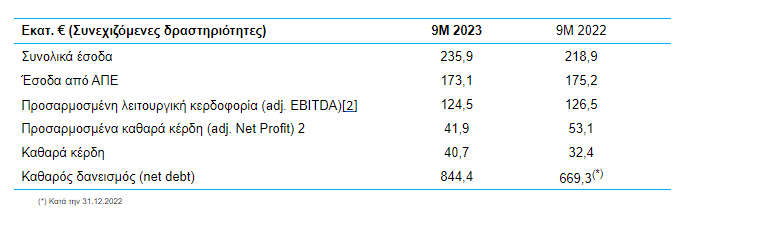 H προσαρμοσμένη λειτουργική κερδοφορία από συνεχιζόμενες δραστηριότητες (adj. EBITDA) 2 για το Εννεάμηνο του 2023 διαμορφώθηκε σε 124,5 εκατ. ευρώ έναντι 126,5 εκατ. ευρώ την αντίστοιχη περίοδο του προηγούμενου έτους. Σημειώνεται ότι η λειτουργική κερδοφορία (EBITDA) κατά το Εννεάμηνο του 2022 είχε διαμορφωθεί σε 105,6 εκατ., επιβαρυνόμενη με πρόβλεψη (μη-ταμειακή) 20,9 εκατ. ευρώ σχετιζόμενη με το πρόγραμμα δωρεάν διάθεσης μετοχών, έναντι λειτουργικής κερδοφορίας (EBITDA) 123,6 εκατ. ευρώ για το 2023.